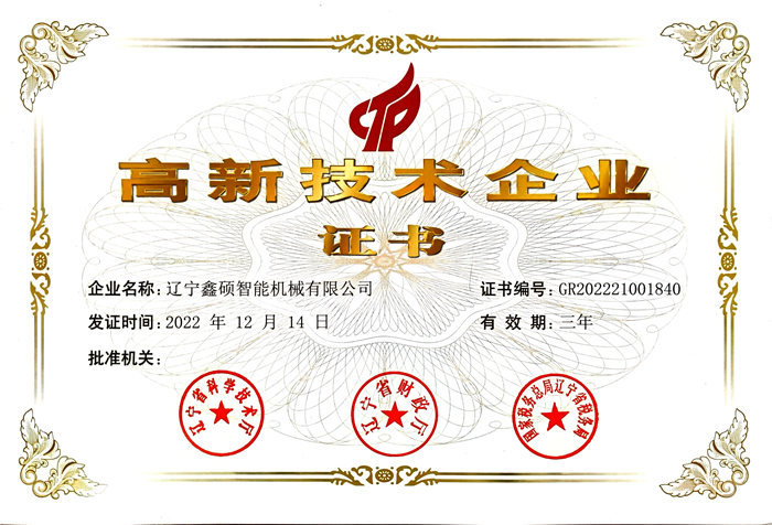 根據(jù)《高新技術(shù)企業(yè)認(rèn)定管理辦法》(國科發(fā)火〔2016〕32號)和《高新技術(shù)企業(yè)認(rèn)定管理工作指引》(國科發(fā)火〔2016〕195號)有關(guān)規(guī)定,憑借雄厚的研發(fā)隊伍、專業(yè)的技術(shù)實力、持續(xù)的創(chuàng)新能力及科學(xué)的企業(yè)管理,經(jīng)過各部門嚴(yán)格的測評和層層審批,遼寧鑫碩智能機(jī)械有限公司正式被認(rèn)定為國家級高新技術(shù)企業(yè)。